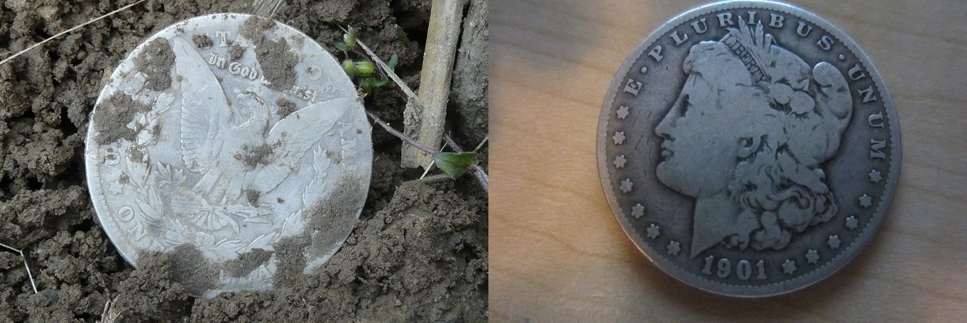 Свершилось!!! Мой первый серебряный доллар. Пусть американский а не канадский, но какая разница, я мечтал найти его почти 4 года, и вот, наконец, ОН! А год чеканки вообще сказка. Еще по гурту показавшемуся из земли я уже понял что передо мной. Сердце ухнуло и заколотилось с бешеной скоростью, вброс адреналина просто неимоверный… Второе фото после чистки.