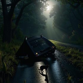 Ночная чернота сгущалась между стволами деревьев, будто живая, дышащая материя. Дорога, узкая и петляющая, тянулась сквозь чащу, окутанную сизым туманом. Редкие фонари вдоль дороги тускло горели, отбрасывая жёлтые, дрожащие круги света, в которых метались мошки. Их свет не пробивал мрак, а лишь подчёркивал его глубину. Где-то вдалеке ухала сова, её голос разносился эхом, сливаясь с шелестом листвы под слабым ночным ветерком. Ветви деревьев скрипели, будто перешёптывались о чём-то неведомом. По краям дороги зияли чёрные провалы, заросшие папоротником и колючим кустарником. Время от времени в темноте мелькали огоньки. Может быть, светлячки, а может, глаза хищника, ждущие, что зазевавшаяся зверушка выскочит на дорожное полотно.
