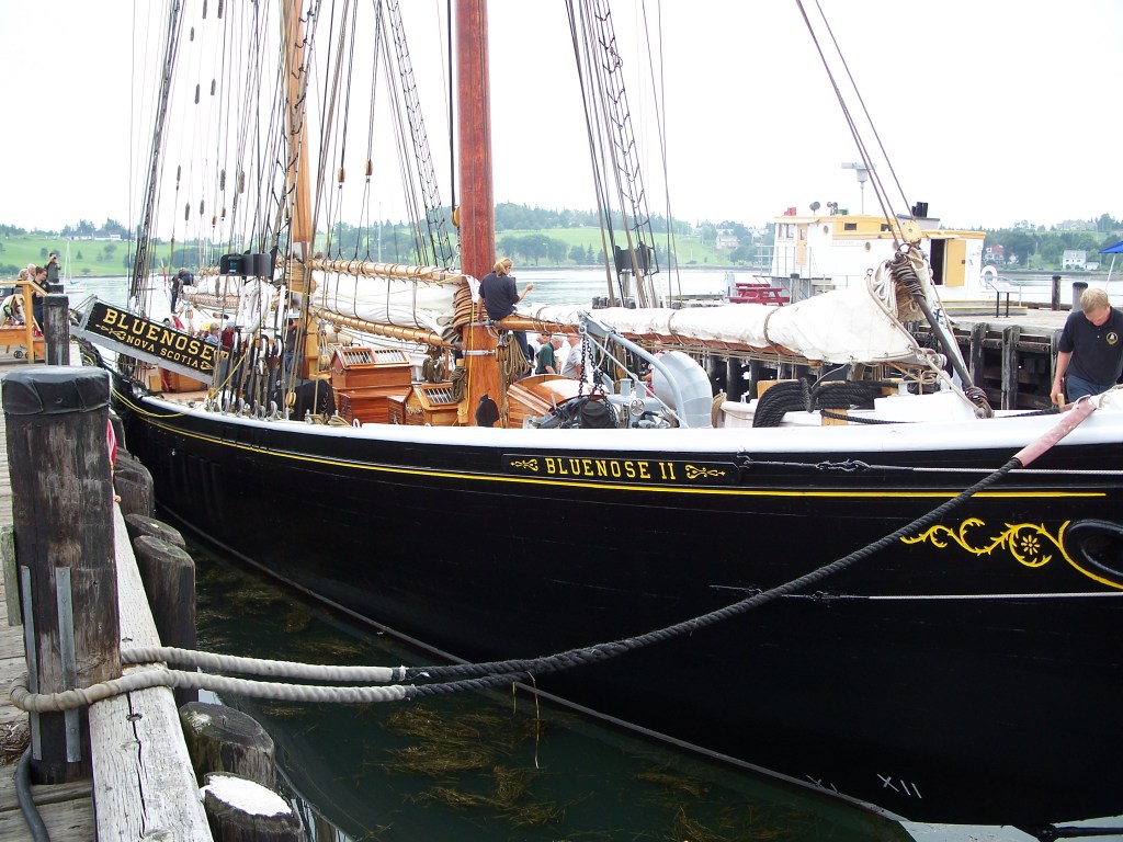 И конечно, нельзя было не увидеть её — самую известную яхту, пришвартованную тут же, у набережной. Это была «Блюноуз», та самая легендарная шхуна из Люненберга, чей изящный профиль отчеканен на аверсе канадской десятицентовой монеты. Она стояла не как музейный экспонат за стеклом, а как живой, дышащий историей корабль. Её мачты упирались в глубокое голубое небо, а начищенные леера сияли нестерпимым блеском под лучами солнца. Я читал о её подвигах: как она неизменно побеждала в гонках самых быстрых американских рыболовов, как она была гордостью всей провинции. Но сейчас, видя её воочию, думалось не о трофеях, а о другом. Я представил, каково это, быть у её штурвала в открытом океане, когда ветер натягивает паруса в тугой барабан, а солёные брызги бьют в лицо. Это же не просто корабль, а характер, отлитый в дереве и парусине: упрямый, быстрый, неутомимый. Настоящая «Новая Шотландия». Рядом остановилась пара с ребёнком.